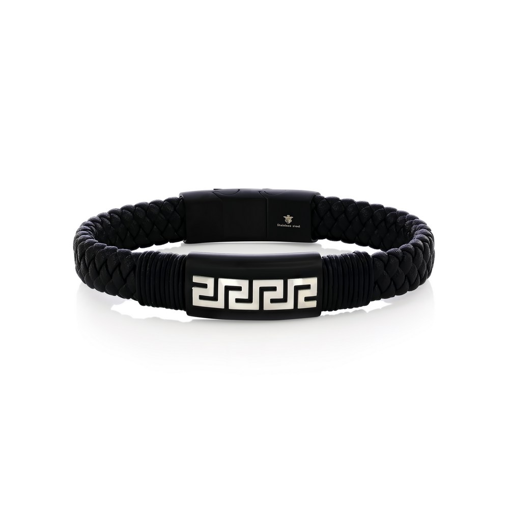 Stainless Steel, Braided Leather Greek Key Bracelet – Black