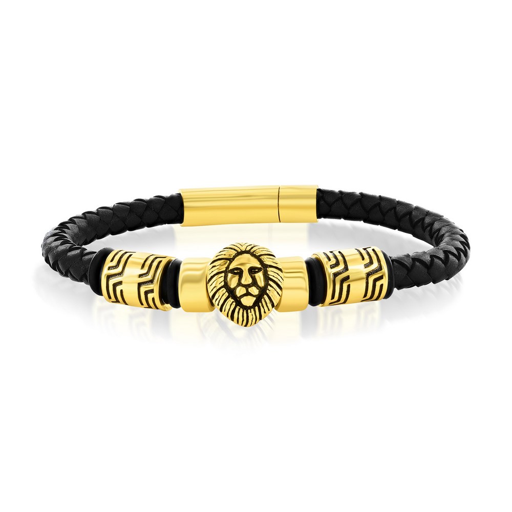 Stainless Steel Oxidized Lion, Genuine Leather Bracelet – Gold Plated