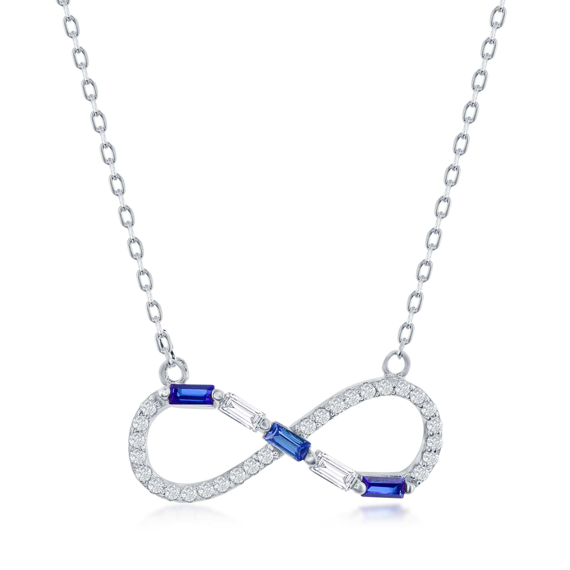 Sterling Silver Round & Baguette CZ Infinity Necklace – Sapphire CZ